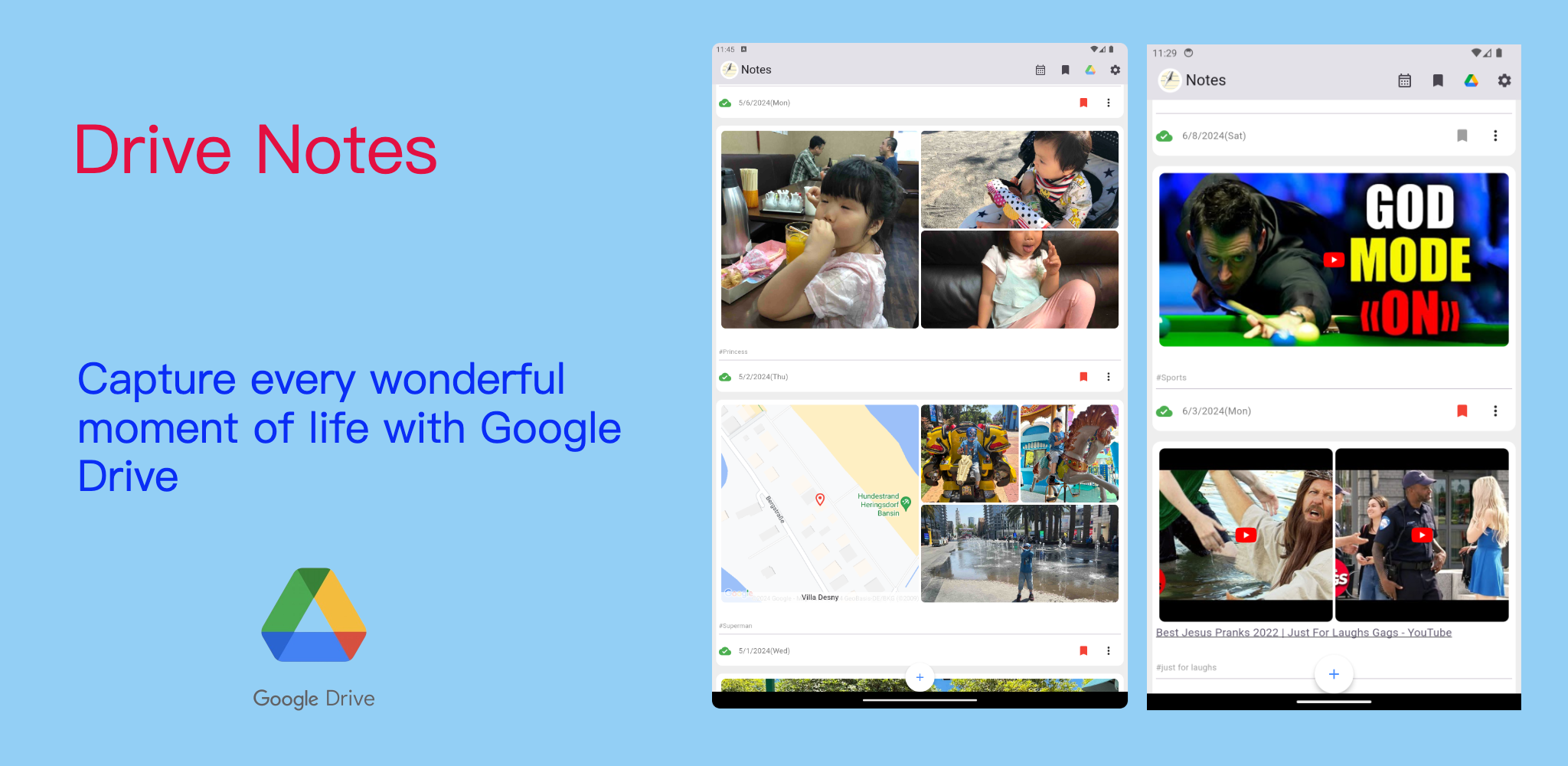 Capture daily moments and special events with photos, web images, and YouTube videos. Securely store data in Google Drive for real-time cross-platform sharing.